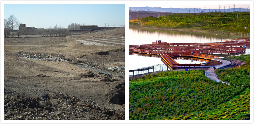 经过多年不懈努力,昔日的污水库变身为美丽清澈的湖泊,湖底的部分污染底泥经科学处理后在湖边化为岛屿。新奠基的生态岛项目陆地面积42公顷,水域面积118公顷。除了净化改良水域,该项目还将原有垃圾填埋场盐碱地块进行深度生态修复,使污染场地“变废为宝”。